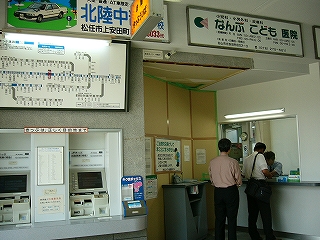 駅舎内のコンコースは手狭で、メインは扉つきの待合室だった。建物の大きな北陸の駅は、だいたいこうなっている。中にはCHAOの売店が入っていて、冷房がとても効いていそうだ。お客もなかなか入っていた。