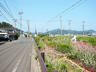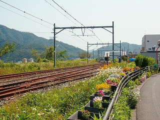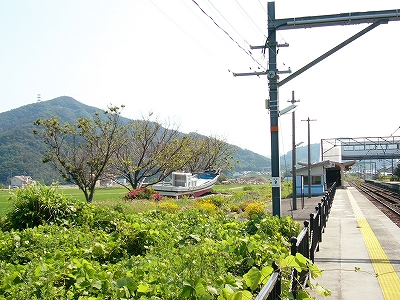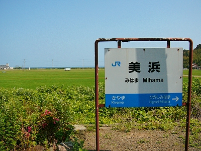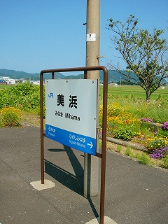 昼ではどちらかというと多い方に入る十数人の客が引けると、官立の駅は空っぽになって、夏の日差しがただただ降り注いだ。しばらく列車が来ないようだ。麦藁帽子のおじさんが堂々と線路内を歩きはじめ、草を刈り、花を世話しはじめた。この駅はとても花が多く、美花駅ともじったのではないかとおもうほどで、愛情というものを感じた。無名の人の業が同じく無名である私の記憶に永遠に残る。駅の裏を見て、「このために美浜に来たんだ、来てよかった。」 こんなふうな主要駅の裏は、たいてい宅地や工場になっているはずだけど、ここは水田が目いっぱい広がって、その水平線に 若狭の鮮やかな海が、細く見えている。裏口を造ってほしいくらいだが、駅前から遠回りして向かおう。