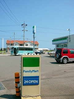 帰りがけ、この先もうここでくらしか買い物できないだろうと、平野のただ中にあるファミリーマートで、パンと飲み物を購入。でもこの店目立たない。だって緑と青の配色でしょ。