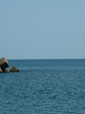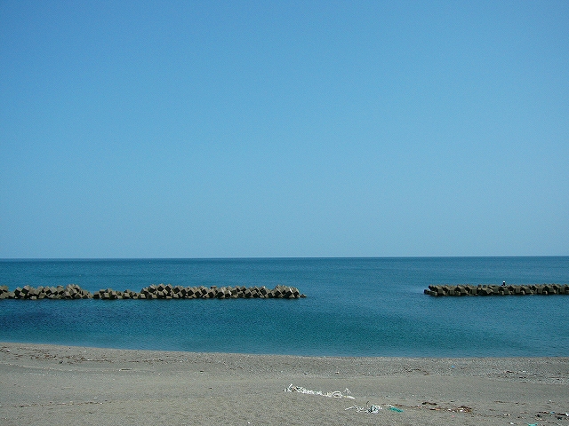 道のへりに立つと、抱えきれない空間が人知れず 波動を繰り返していた。海蝕で深く落ち窪んでいて、護岸の大階段を降りる。碧とも蒼ともつかない海面が曲がるように広がって、「この色はいったいどうなってるんだ。」 これが若狭の海なんだと一人で感心した。しかし浜は 粗めの砂で、鼠色っぽかった。そしてそこらじゅう漂着物だった。きたないが、ここも含めて各国 陸に人住むゆえの海の相貌だった。やはりシーズン前に地元の人が掃除しているのだろう。季節前の海というのも素顔で思いがけずいい…。内陸なので、八月九月の海しか知らなかった。