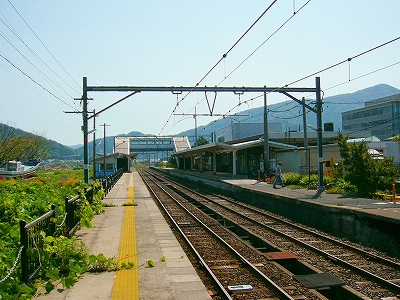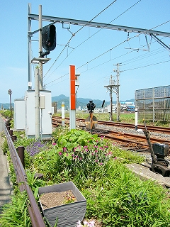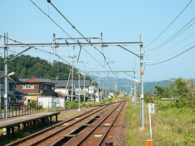 門型架線柱のある美浜駅構内。