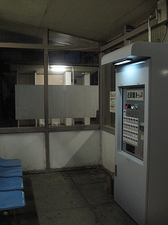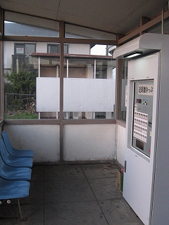 椅子のあたりから見た駅舎内。時刻表に自動販売機、ゴミ箱、と駅らしいものが揃っている。
