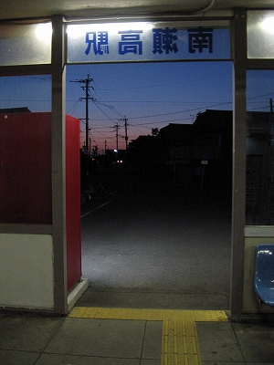 ホームから駅舎に入ろうとするところが短い下り階段になっていて、ひらがなの駅名標が照らし、熊本方面などと書いたものもあったので、小路に入るかのようだった。建物は透明板とステンレスの桟でできていて、中は狭苦しい。灰色の板は足回りだけで、高さのかなりの部分が透明板なのは、防犯上、中に人のいるのが外から見てぱっと捉えられるようにだった。それで落ち着かなかった。時刻表を見ると、なんと時間2、3本になっていて、鹿児島本線も下るとこんななってしまうのかと嘆息した。