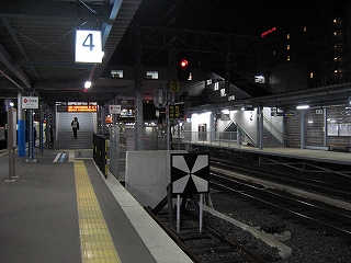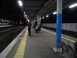 南瀬高から1時間15分ほど、熊本に着いた。ホームは仮設でどこも新しい。時刻は20時15分、帰宅時間のため、人群れもそこここに見られる。熊本に来て旅心地が少し持ち上がり、もう少し足を延ばすことに決定。でも20分間ほど、何人もの人と、殺風景かつ寒いホームで待っていると、むなしくなってきた。おもしろげなくやって来た八代行きに乗る。思いのほか混雑しはじめたときは、やはり変なことはやめた方がよかったかと思いはじめた。