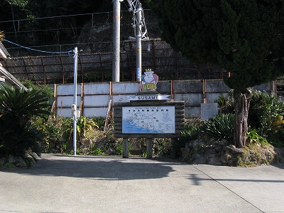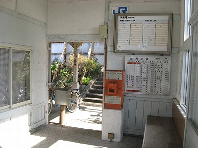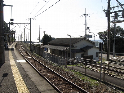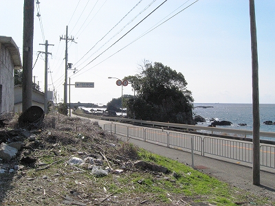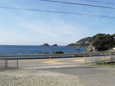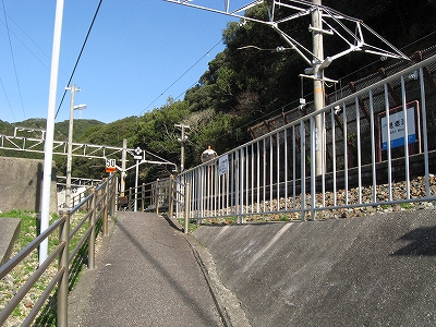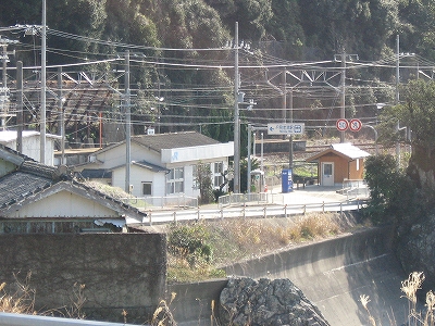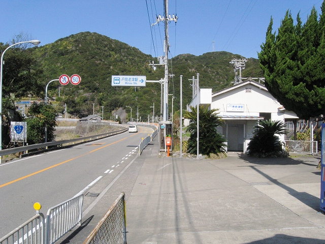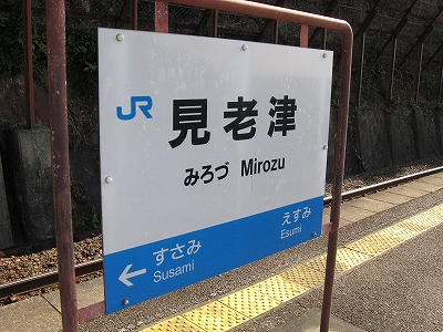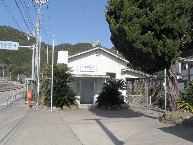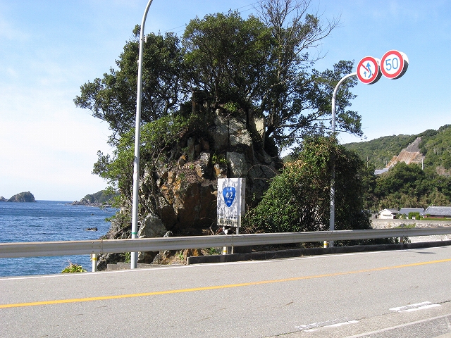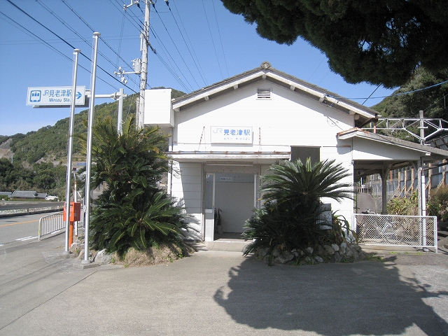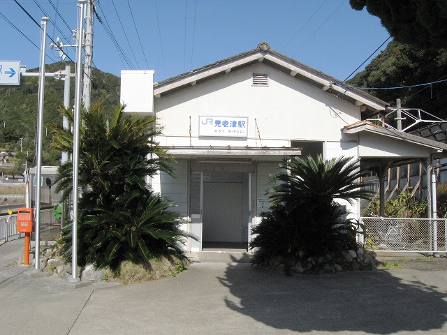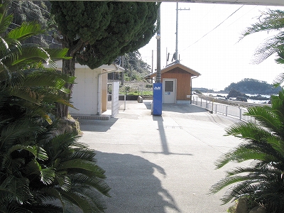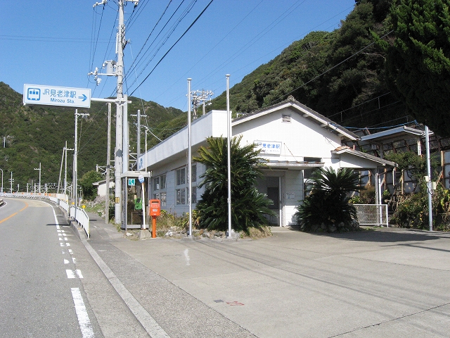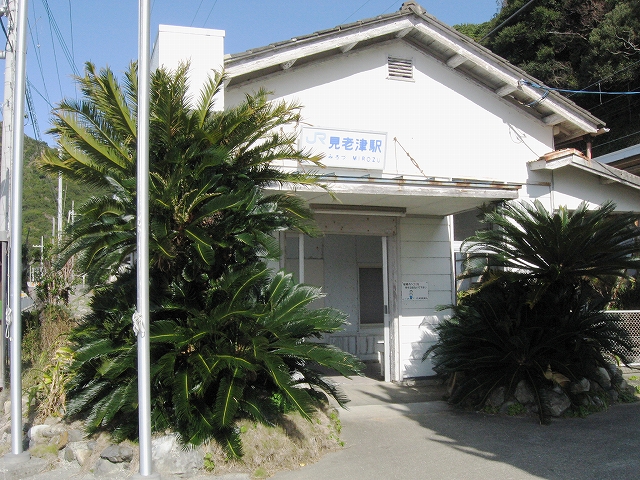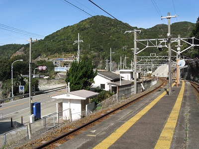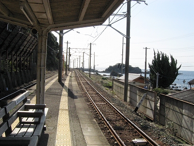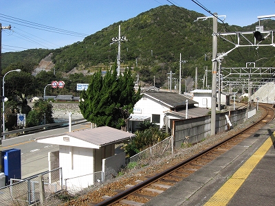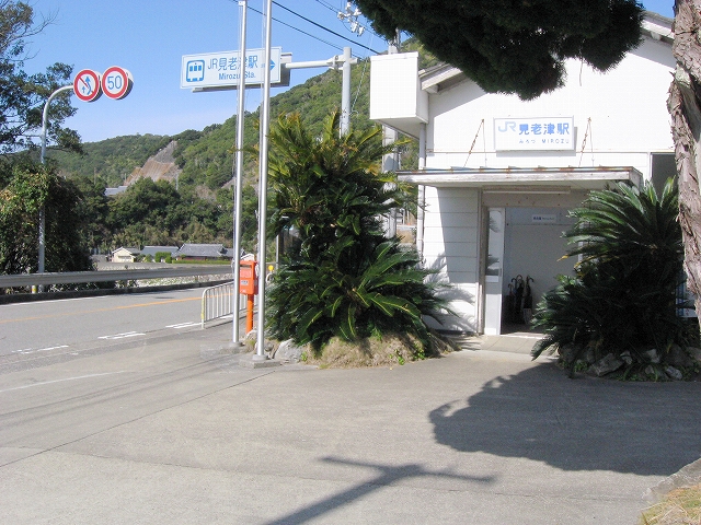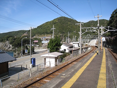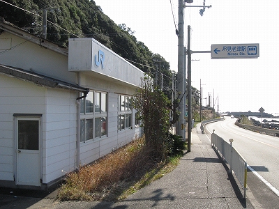 ホームからはもちろん海を見わたせる。「ここは紀南も深いけど、国道と仲のいいタイプなんだな」 鉄道はほぼ山辺の堤を走り、位置は高いが、孤高ではなく、こまごまと小屋などの夾雑物もある、迫る国道のおかげで親しみを感じる。ただ、いかにもそのすぐ向うは海という感じで、巌が四十二号、見老津と掲げていて、いかにも紀南なので、トライバーはきっと止まりたいと思うだろうなあ、しかし下車の概念がない車は、いとしい同乗者とともにこあの巌を目に焼き付けるのだろう、と。