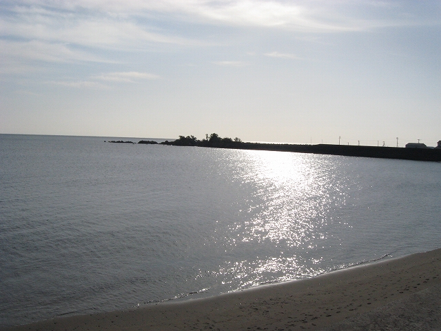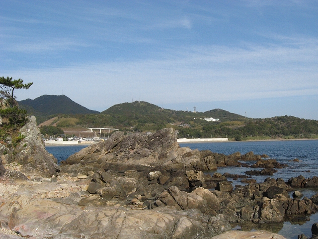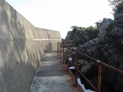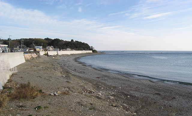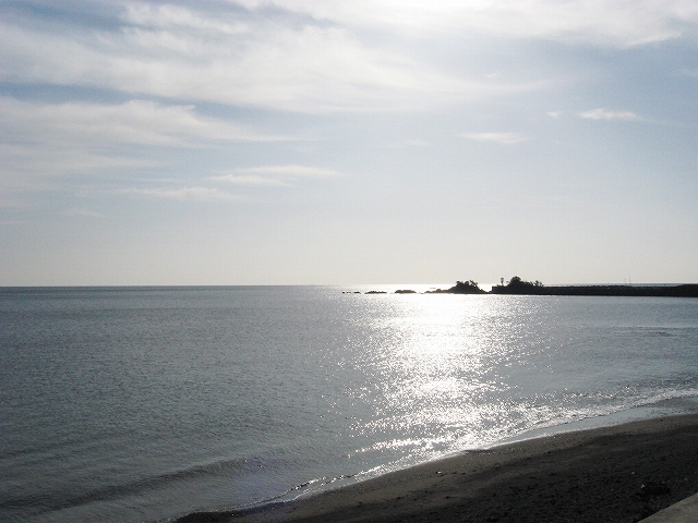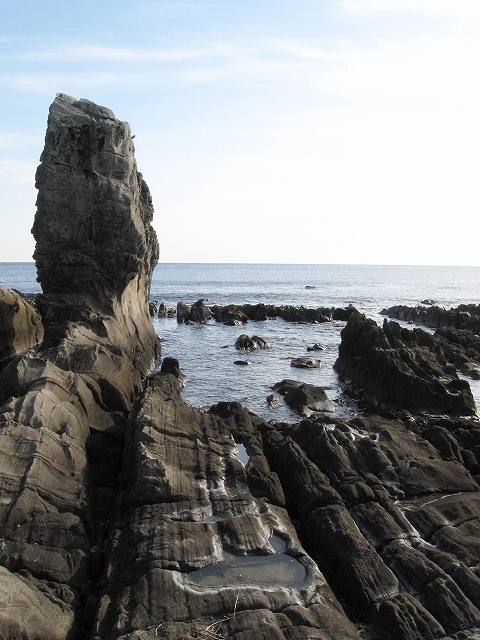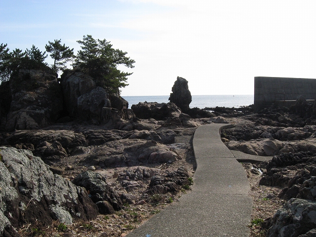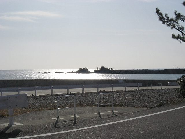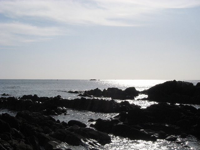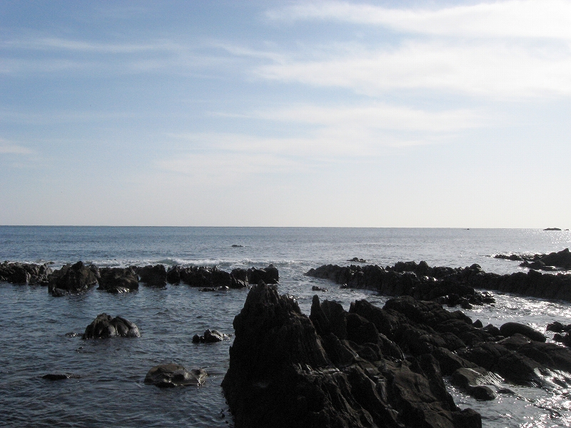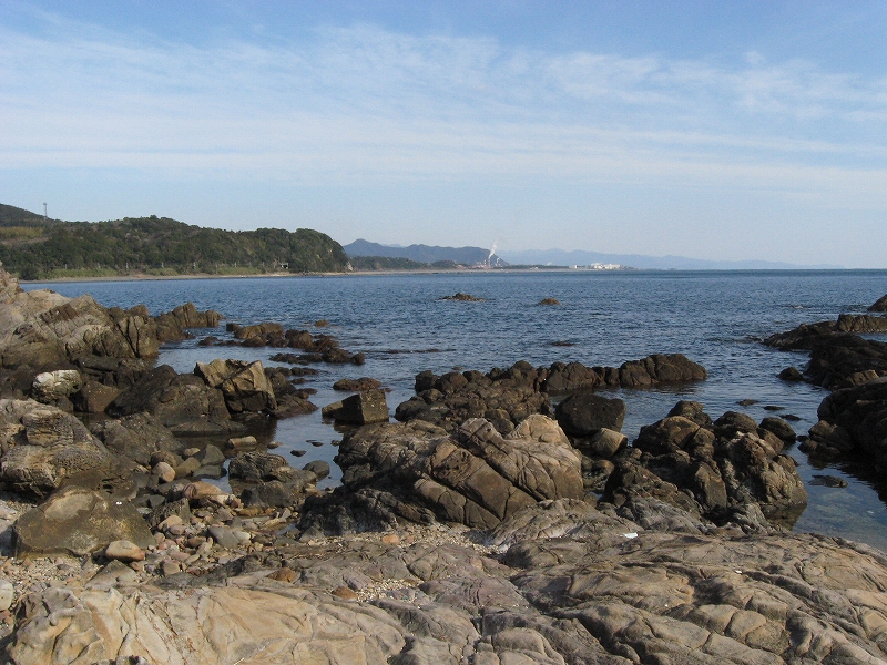 まあ海でも見るか、と、いつものように「止まれ」の標識まで進む。しかし海岸は防波堤を造成しており、見るべきものはなかった。そうでなくともいうほどの浜でもなかったようだ。けれど目を西に転ずると、いかにも面白そうな磯が突き出しているではないか!