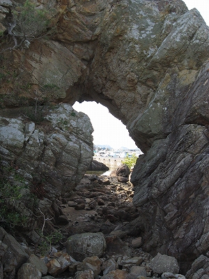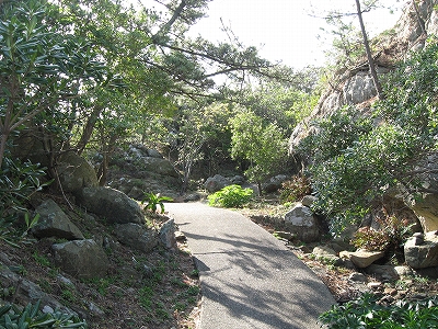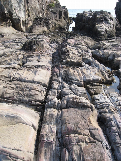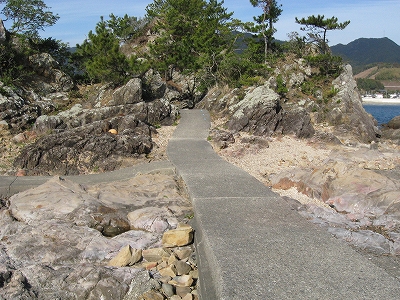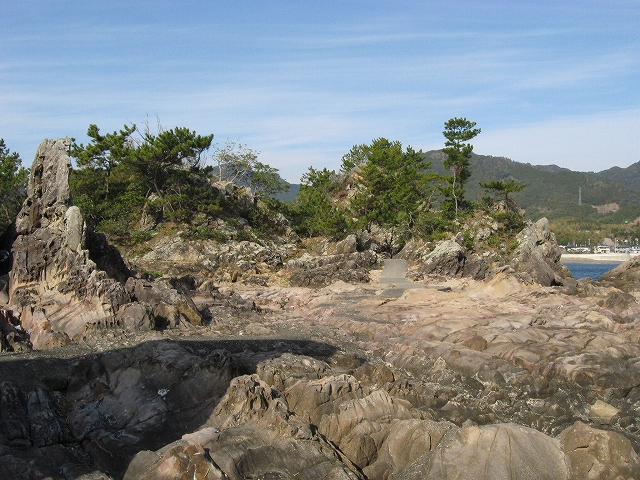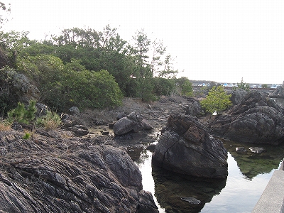 目を付けていた荒磯へはさらに奥まで歩かされる。漁港の奥に入り込んで、磯場に無理にコンクリートの道を作ったところを進むと、四国足摺の大竹小竹のような節理がちょっとだけあり、おなじ黒潮の海なんだなと感慨深かった。ただこの辺もあまり人も来ないのか、かなり荒れている。暖地性植生が幹をくねらせているが、まばらだし、南海道にミニ観光地といったところだった。海水浴客がついでに見に来るぐらいなんだろうか。
