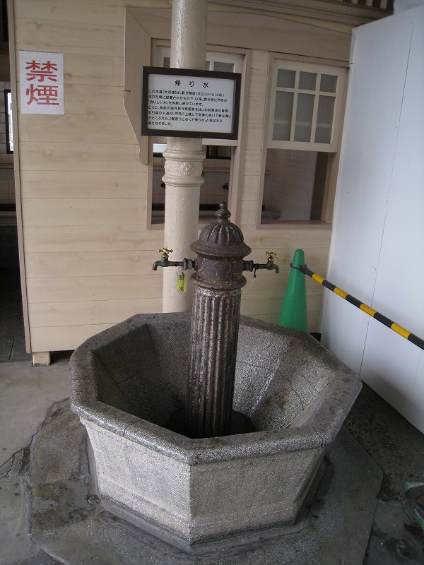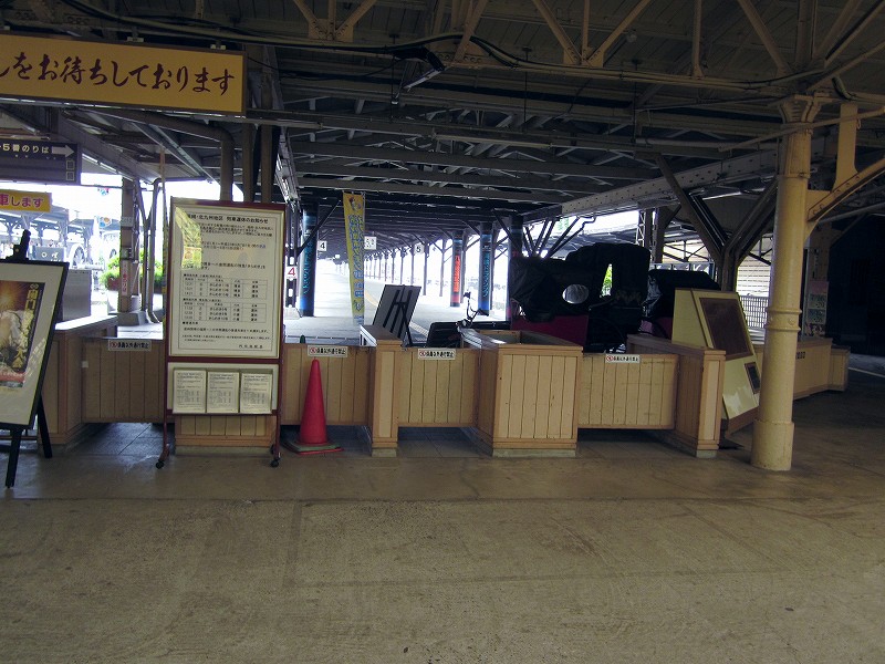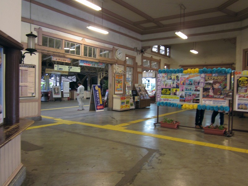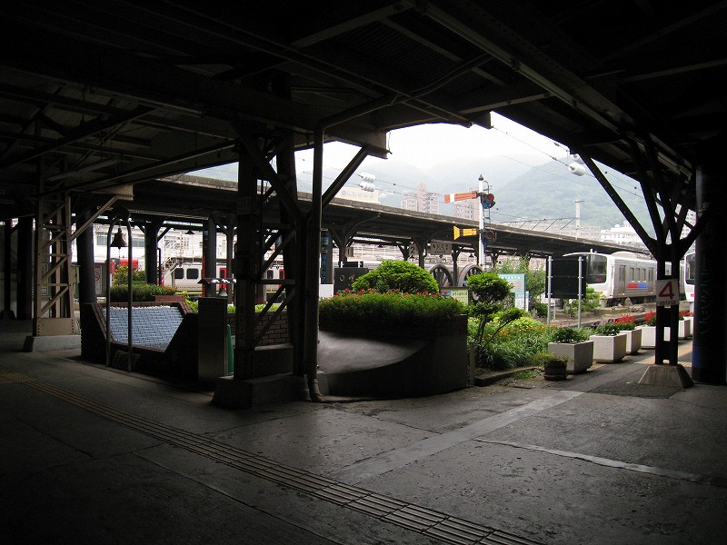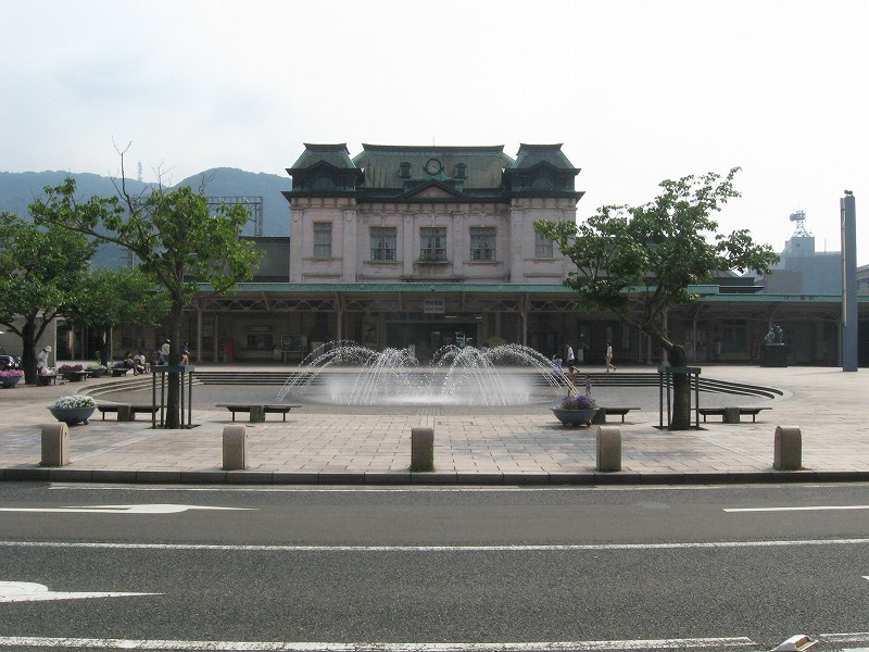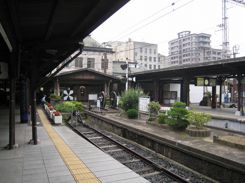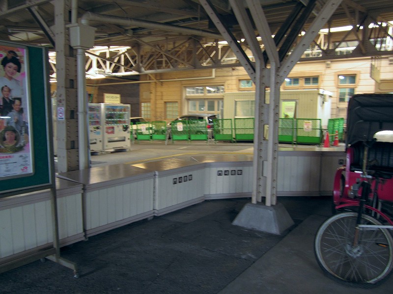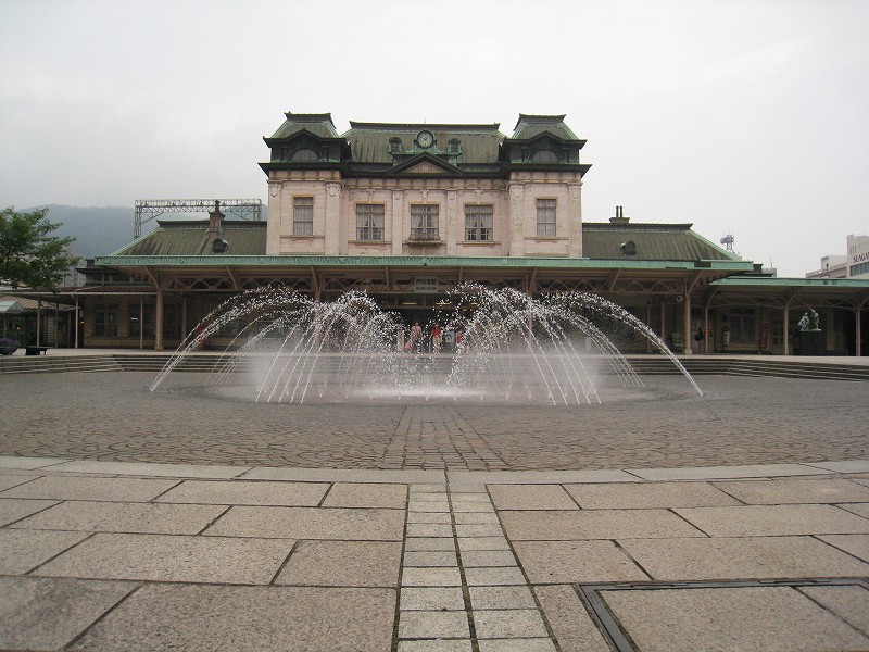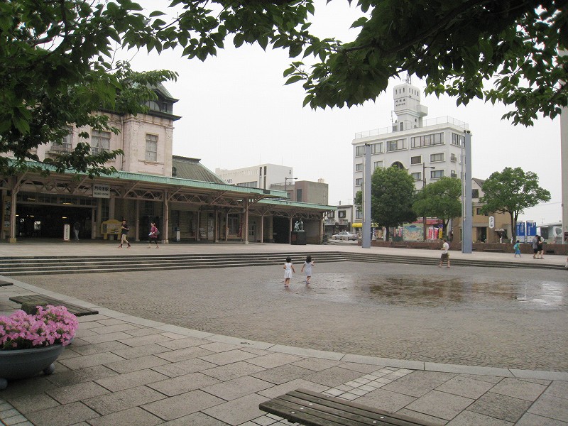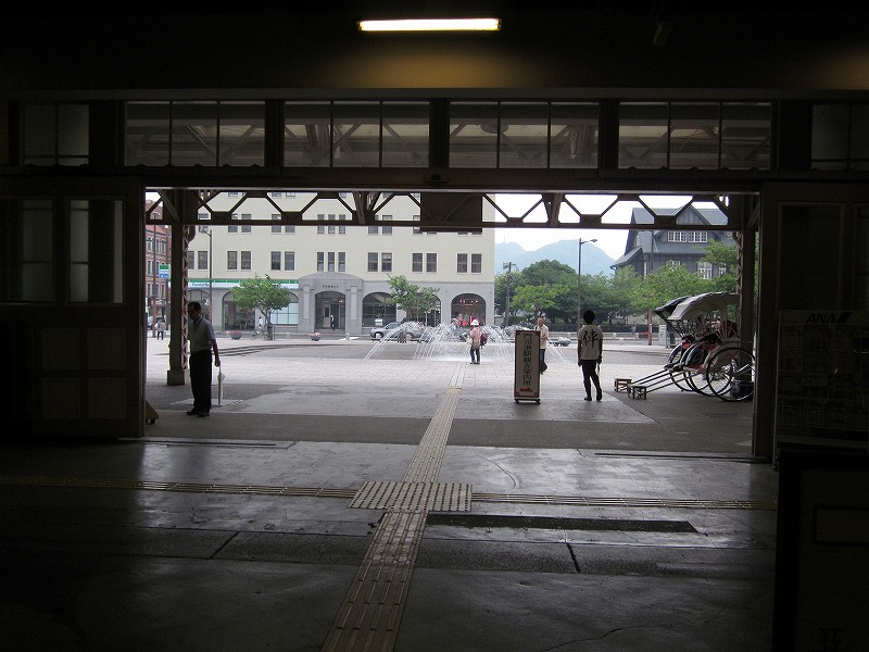 僕はこの駅は、どちらかというと観光地ではなく、地元の人よりのものだと思っていた。だって、たしかに「場売符切」なんてレトロ風な看板がかかっているけど、いずれもそんなに主張してないし、何よりもそういった改変は、もうだいぶ昔になされたもののようだから。けれど、駅舎の外の間口から見える風景が、これまで幾千と下車してきた駅とはまったくく異なっているのだ。なんと、駅前広場が平面の噴水になっている…