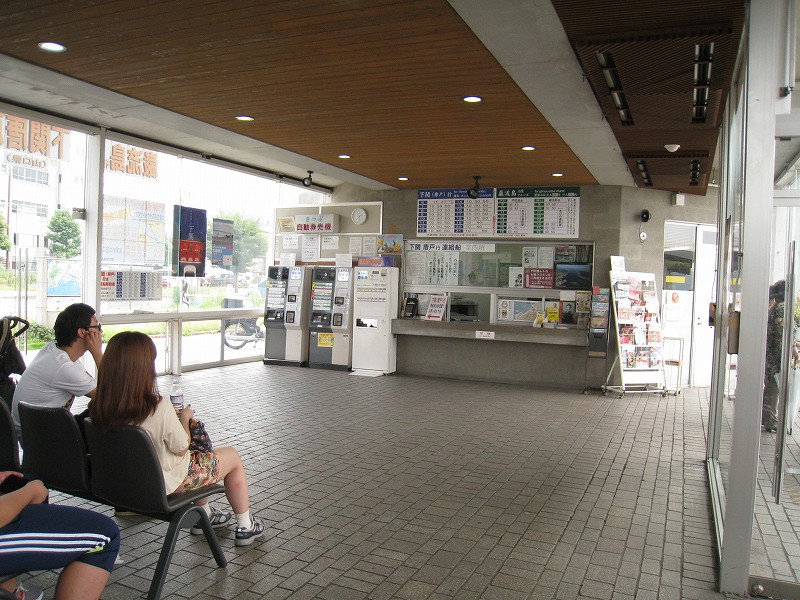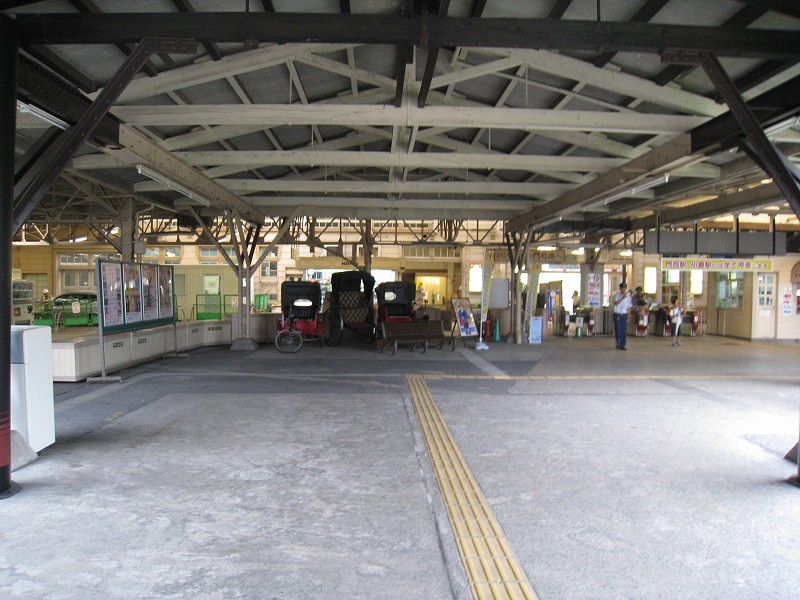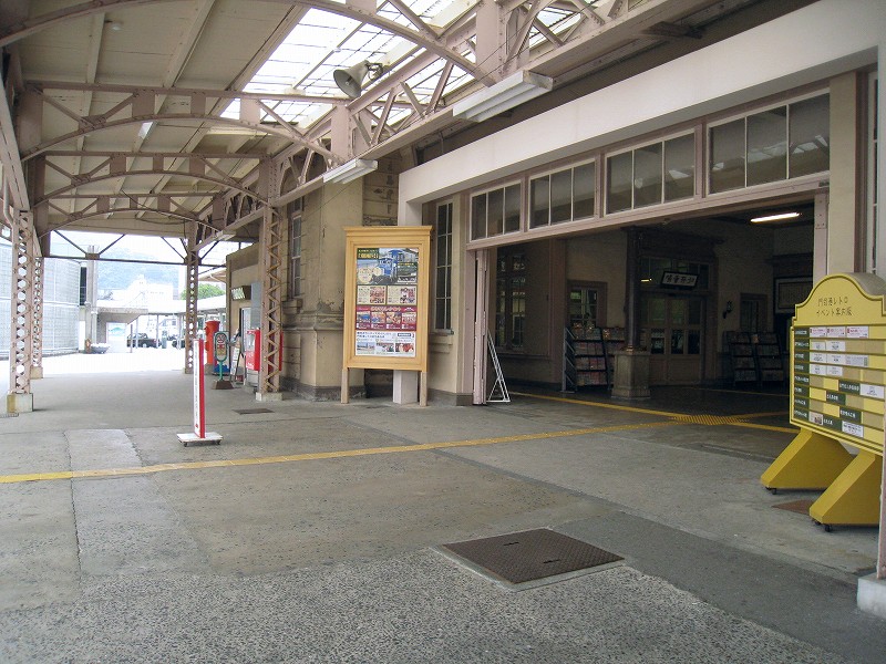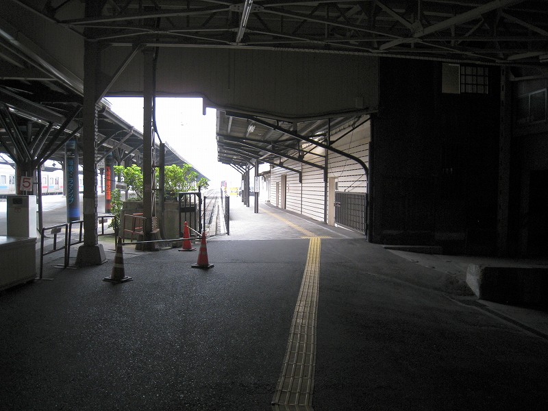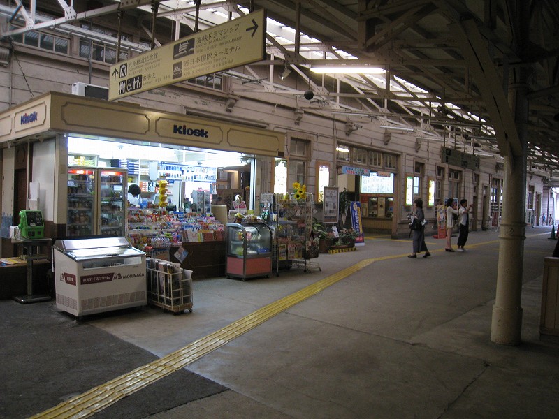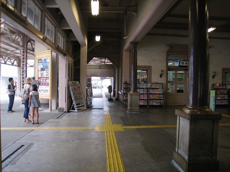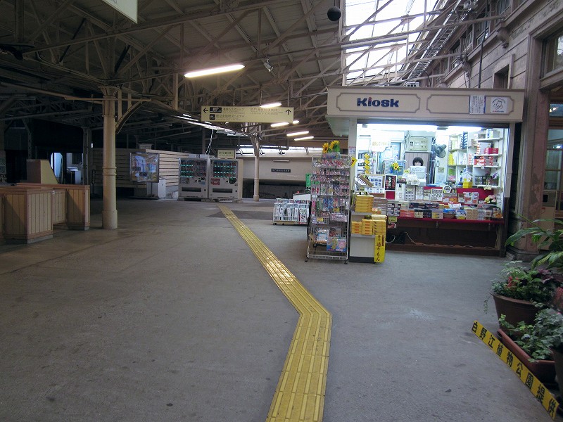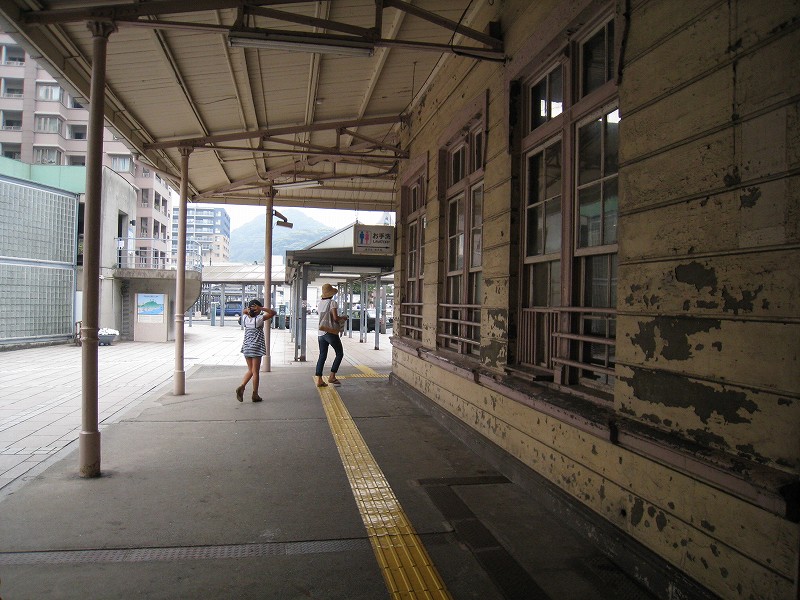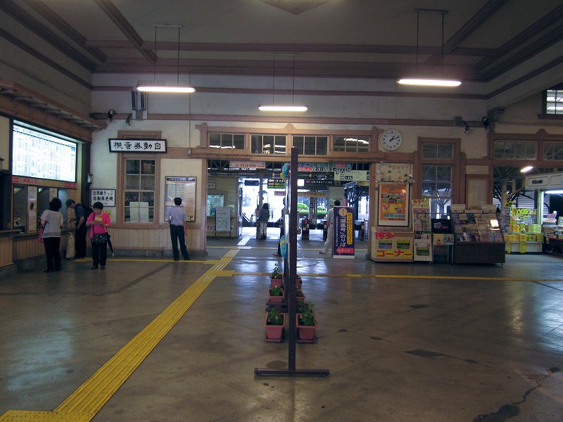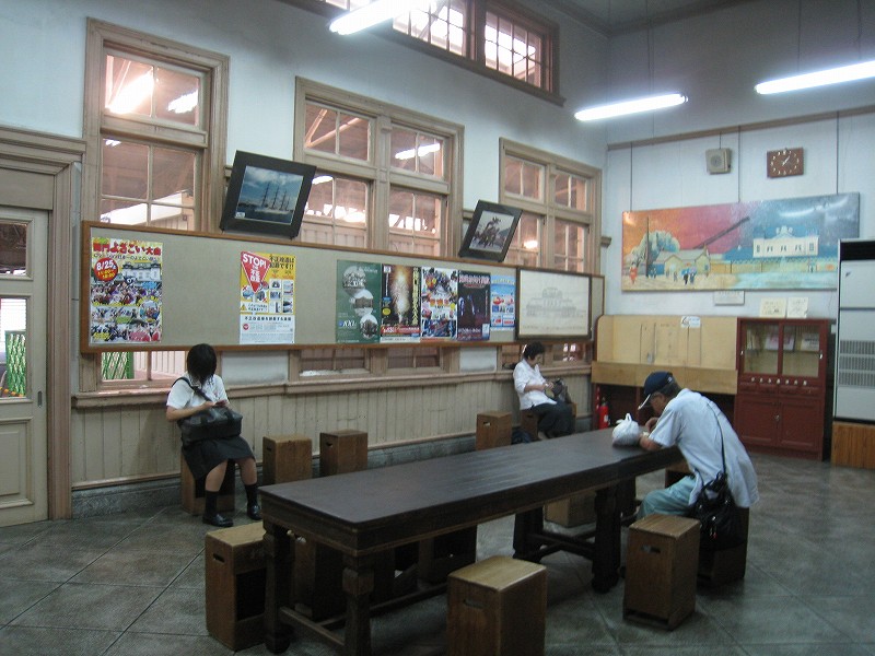 駅舎内はどちらかというと旗艦駅の木造舎という感じで、今は空け放しのいろいろな間口も、かつては目的があって設けられ、使われていたものなのなんだろう。それがこんな風に自由に通ることができ、解放されているのは、前時代的な風習や考えが、そして権力が、完全に無力化されたことを象徴するかのようだった。待合室もきっと、かつては紳士淑女の交流の場だった。しかし今となっては猫が棲みつき、婆さんが暑さにこらえられずアイスをかっくらっている。コンコースは窓枠など、どの木部も彫刻されていて、格式を窺わせるには十分すぎた。けれどペンキで塗りたくられ、そして傷だらけだ。しかし僕は、そんな風に貴族趣味が民衆に下りて行ったさまが好きなんだ。だから京都の御所が、天皇が出て行ってから荒れ果て、便所のように扱われていたなんていう話も、割と好きである。