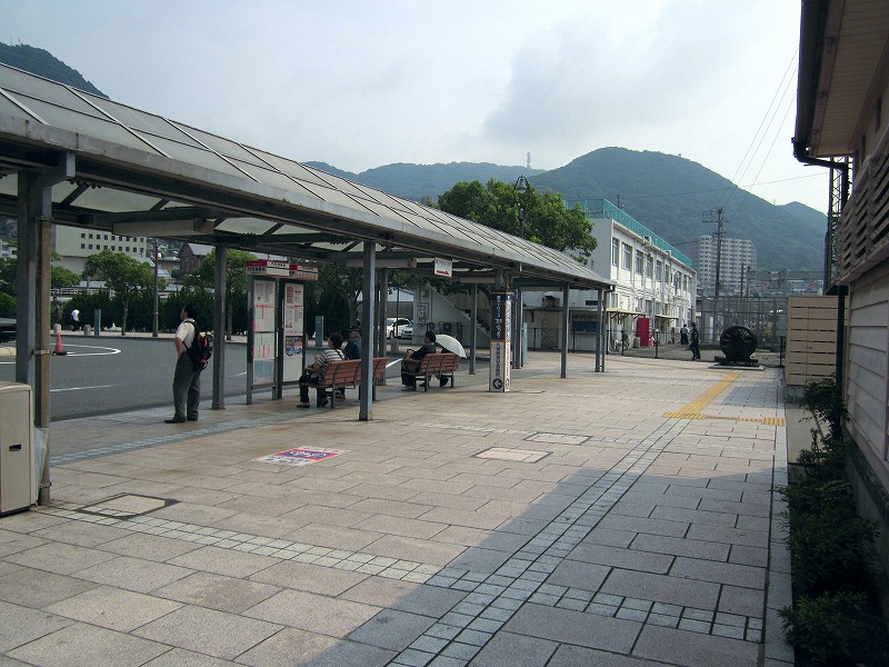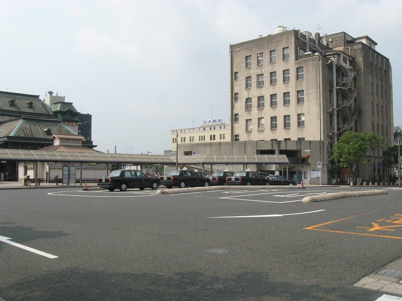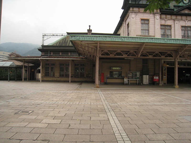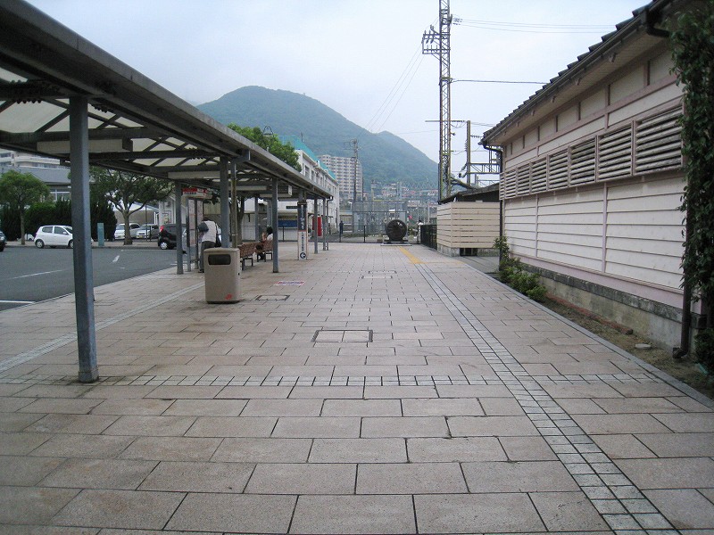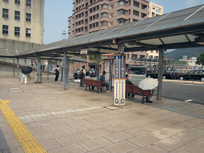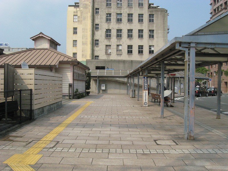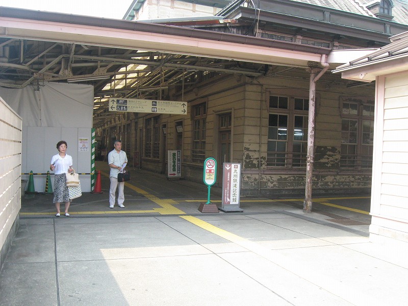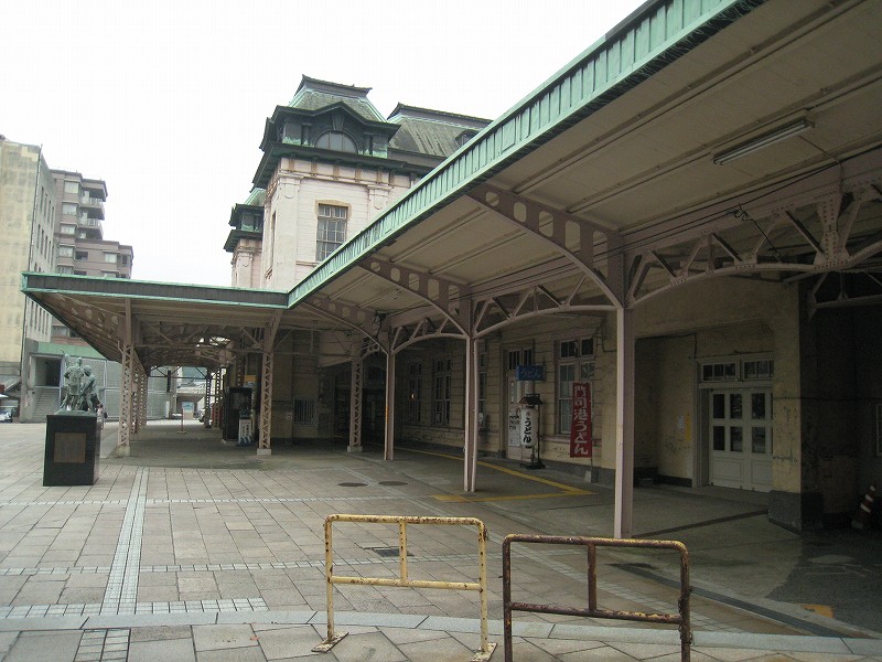 門司港駅の威容を保つため、地元の人はこんな地味なところで車やバスを待つことになります。