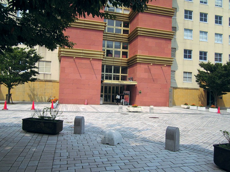 この右側は駅の構造物の一部です。ここを右に回り込むと駅前広場です。
