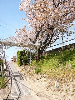 下り坂の風景。茶色の葉を出した桜とともに。