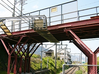 坂の途中から赤い跨線橋を見て。