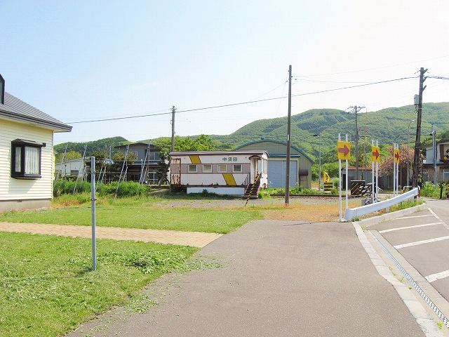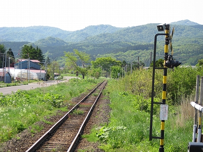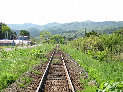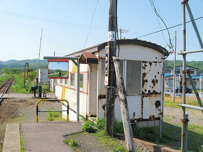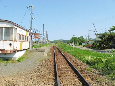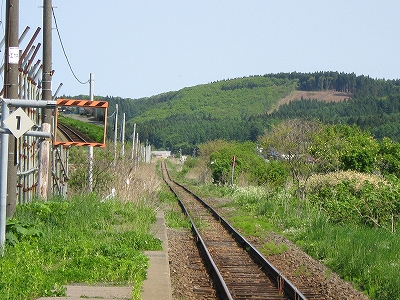 暖流も果ててしまいそうな日本海側から離れて北海道南端の秘境的な山塊に向かって走るが、まだ山には入りこまず、豊かな平野のただ中に停車する。陽光が降り注ぎ、ホームに律義に停車しているかのような 待合室として使われている錆だらけの貨車の横に、汽車はちょうど停まった。外に出ると、冷涼な風が吹きすさんでいた。しかし日差しにやや力あり、あたりはどこもかしこも緑を謳歌している。平野の美しさもさることながら、丘のような低山帯の、とりわけ派手な自然林の黄緑色と植林の濃緑の対比が海藻のように鮮やかで、そのこんもりとしたさまは幾度も掌で撫でてやりたいくらいだ。そのかわり風に乾かされつつも、目でなぞる。あの森の中はどうなってんだろう。