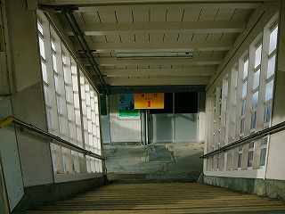 じゃあそろそろ離れようと、屋根つきの短い階段を下りたところ、そこは暗い回廊になっていて、思わず目を見開いた。まさかこんな構造だとは思わない。そういえば、この駅、前後の駅と違って跨線橋がない。そうか、地下道で島式ホームと結んでいるんだ、なんで今までに考えなかったのだろう。地下道でホームを連絡する駅はなかなか趣き深いことが多い。