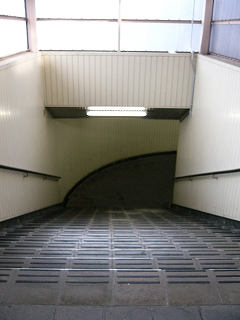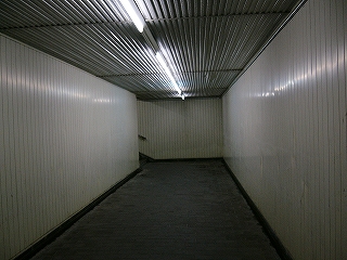 回廊を歩いた端にある、地下通路の入口に向かう。地下道もまた変わっていた。曲がり角はカーブしているし、壁には金属の化粧板がはられている。こんな地下道、各地の田舎の小駅にあっただろうか。こんな体裁にしたのには、きっと何か理由あるのだろうけど、わからない。