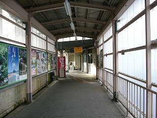 回廊はさも木造であるかのようだった。羽目をはずしたようなところから光が差し込み、こみ入った造りの内部に陰影をつくっている。ホームを擁する斜面にある、わずかな植え込みの緑がいっそう鮮やかだ。乗り場の案内として遠くは大阪や富山が静かに挙げられていて、こんなささやかな駅だけに、まず普通列車に乗ってそれから…と長旅が想われた。