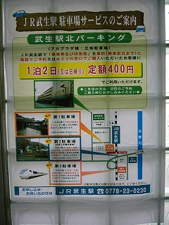 武生駅の駐車場案内。一日前に切符を買った人が安くで駐車場を利用できるというもの。