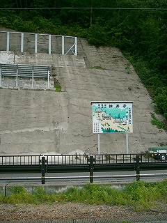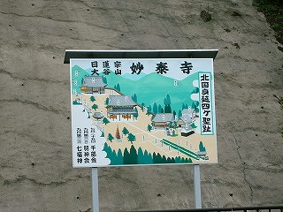 ところでこの乗り場に来て、ようやくこの駅の特徴を思い起こした。それは、山の崖の駅。この乗り場の下り線は山肌の法面に沿っていて、これは下り列車に乗っていると印象に残り、言われるとたいてい思い起こすことができる。その法面の前にはきれいにしたばかりの1.5車線の道路が走り、それが妙に今庄らしい感じだった。ところでその法面の前には古地図風に庭を描いたような看板が高く立っていて、以前から車窓にてとても気になっていたのだが、この日はそれを、じっくり見られた。どうもこの辺にお寺があるのを宣伝したもののようだ。しかし車窓に見せているのではなく、駅に降りた人に見せているのだろう。