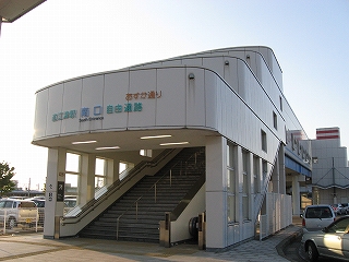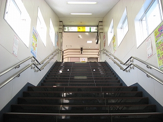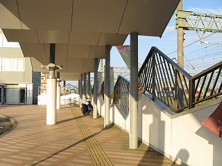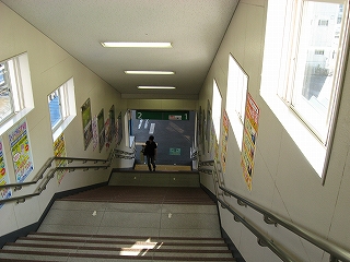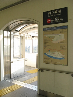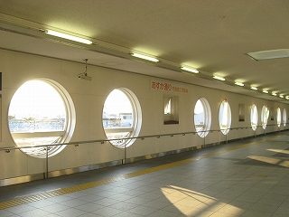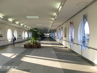 途中で降りられる階段。駅や自由通路はそのとき国内の世界クルージーング界にして冠絶していた豪華客船飛鳥を模したもの。自由通路が177.0m飛鳥が192.8mということで比較されていた。近年は国内で豪華客船という名が敬遠されるとかで名前を変えているとかいうニュースもあったな…。駅は1997年着工。