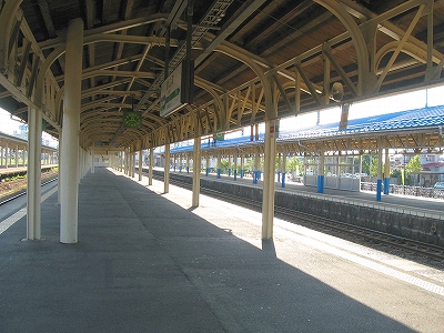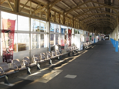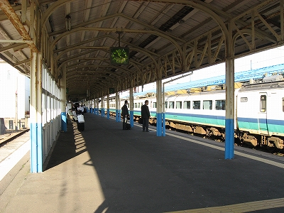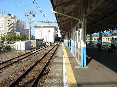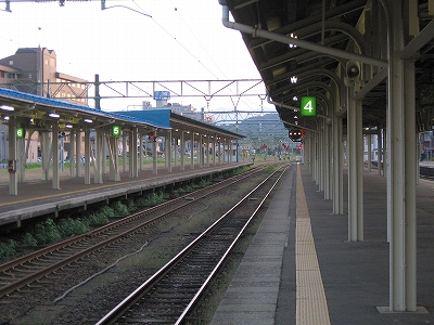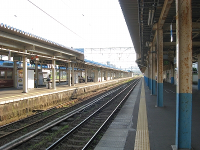 こうして表口に立ってみるとこれといった慨嘆がなく不意を突かれた。そしてこの光景は、数年前初めて降り立ったとき、まともに見ていなかったことに気づいた。心を捉えないものは旅においてははじめから存在しないはずのものなのにそれを如何ともせんとしていたのだろうか。そしてその奥から始まっていた、雁木の 自動車で狭く賑わっているを見て、どっと疲れが出、急に街を歩く気をなくし、海まで出る予定を、蹴ってしまった。ああいう風景とて、どこかで出遭ったことがなかったっけ。海にしても…。何もかも、1回で―せめてもその日1日で―いいような気がした。求めようとしたものは、初めのときと同じものだ。けれどもそんな唯一の感覚を量産したいという欲望がある。駅で分けたり、街で分けたり、果てには国で分けたり。下手したら、駅なんて存在しないときもある。とくにこの、船を模したらしげな角を丸めた段々の白っぽい駅舎が、断片化されて漠然と視界に入る度には。