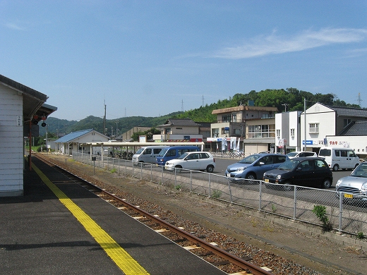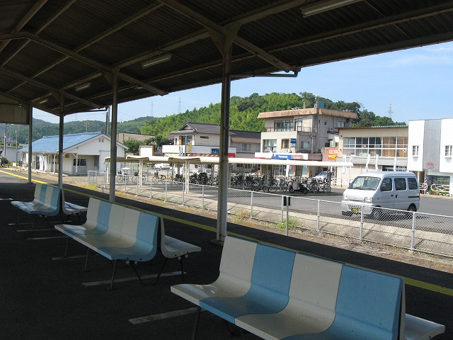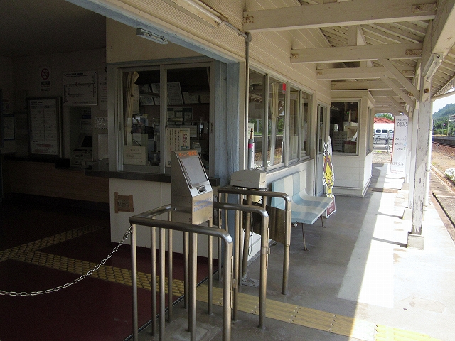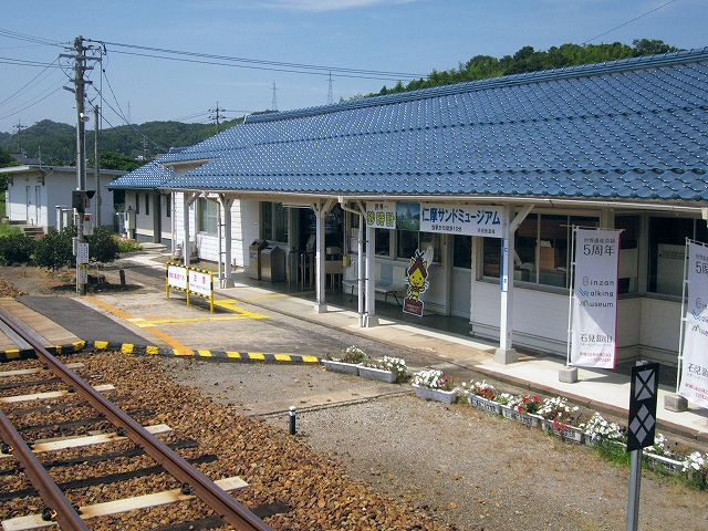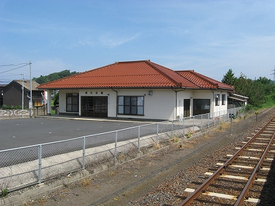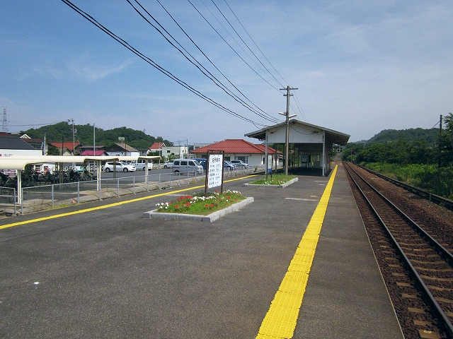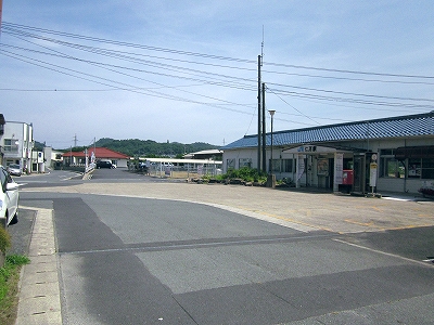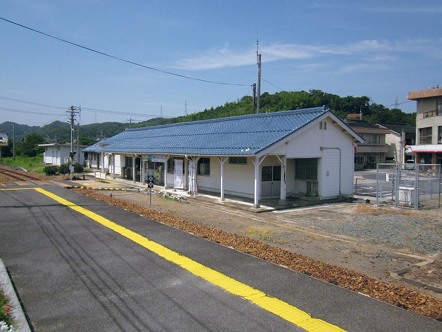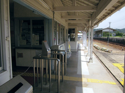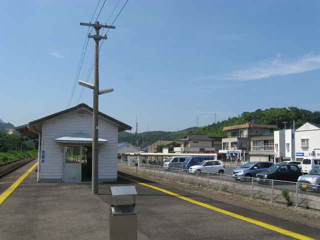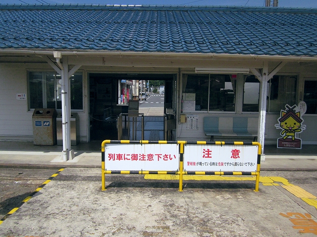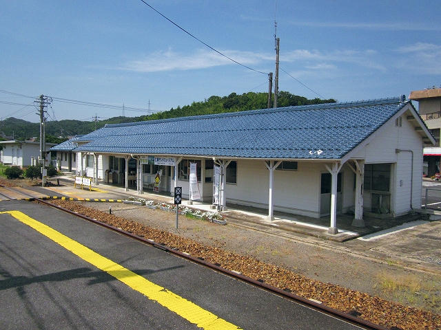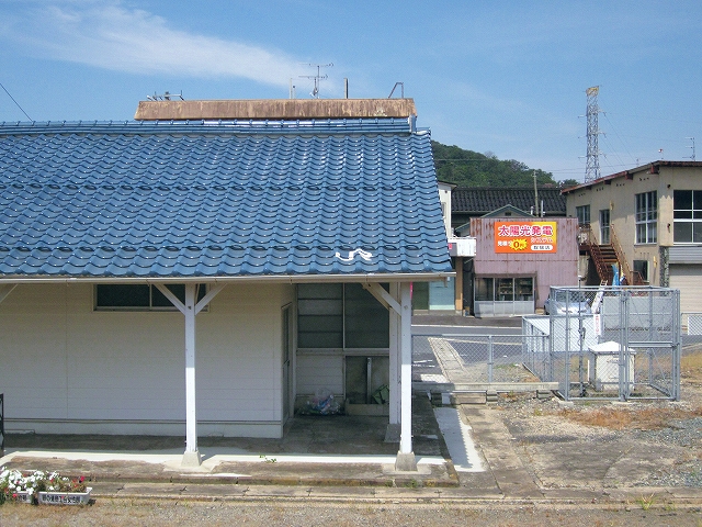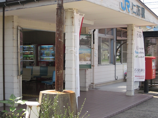 駅舎はかわいい、かわいい水色の石州瓦を広く俯角に戴き、隅の方にワッペンのように、JRのロゴが施されている。