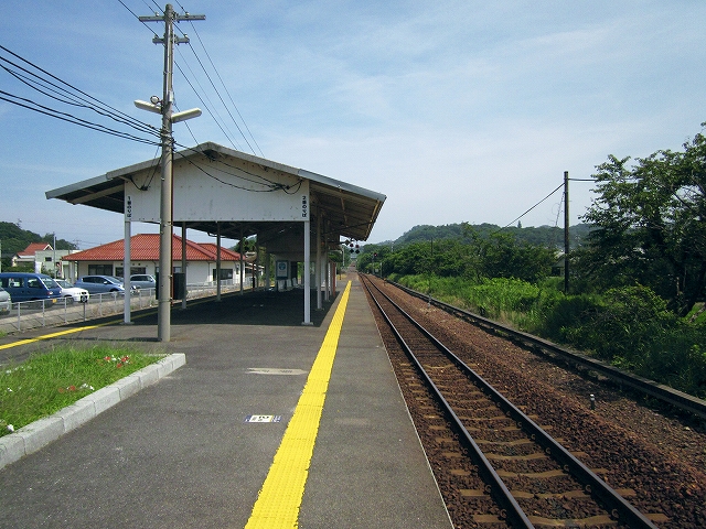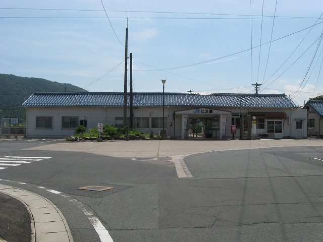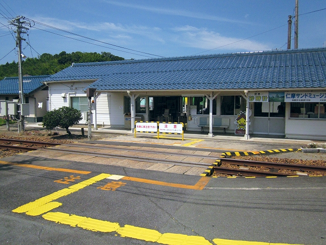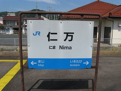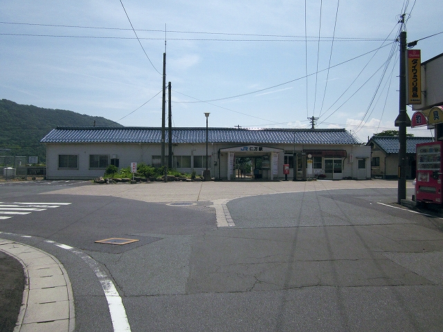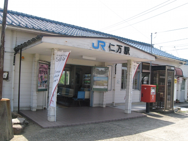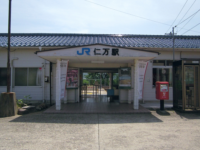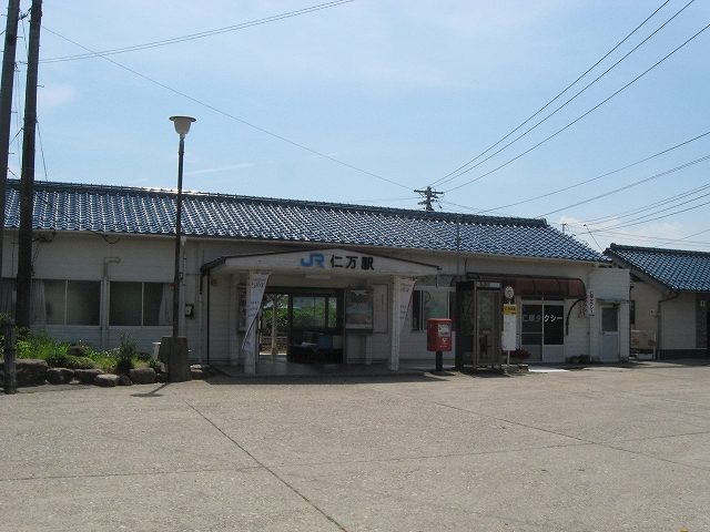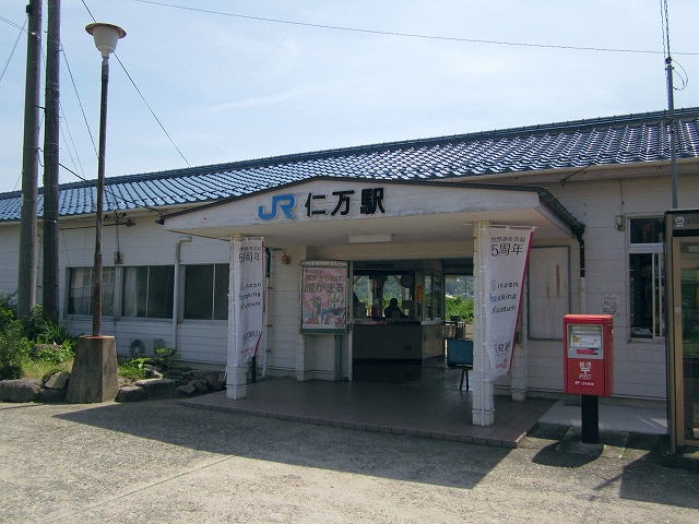 汽車が仁万のホームにへばりつくと、広い構内踏切に盆を持った駅員の姿が見えた。運転士は安心して折戸をひらけ、山陰の子らや嫗らがばらばらっと展開する。大きな上屋を過ぎると、人々は真っ白な熱エネルギーに被曝する。半袖のJR駅員は暑そうにしながらも、きっぷを受け取る。