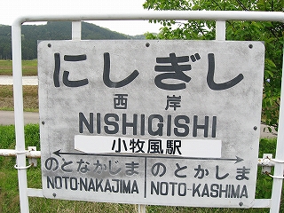 西岸は明るいめの駅で、広場を過ぎると七尾湾岸沿いの道路を車が走り飛ばし、駅前に店名を冠しただけの自動販売機のコーナーがあった。注意して道路を渡り、海を覗きに行くと、七尾湾は静かで、流れがないようだった。一応能登島より北側に入ったばかりのところなので、七尾北湾というのだが、まだこの辺は七尾西湾と似ていた。