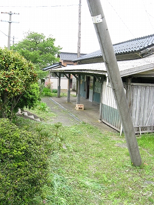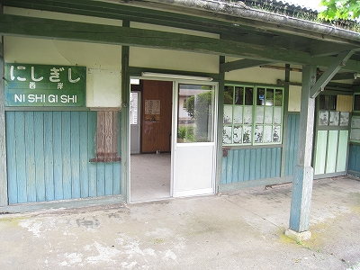 遠回りしようやくそっと駅舎に近づくと、異様だったのは、樹木などの周囲の草が、刈りっぱなしだったことだった。まるで荒らされたかのようだ。草の匂いが、駅舎の軒下に立ち込め、古い埃や黴の匂いと混ざり合っている。にしぎしと書いた緑の木の板が、青緑の壁に貼りつけてあり、あたかも大量に刈られたあの草の色と匂いに侵されているかのようだ。草刈りで人手の入っているのはわするものの暴力的で、やけくそが漂っていた。駅舎の中も、窓口は擦りガラスで塞がれていたが、そのため、中の乱雑らしい様子がぼんやりとした輪郭でわかり、暗い感じだった。