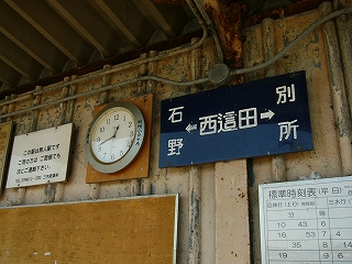 なんでこんなところが最後にと嘆きつつ、またホームだけの駅のホームを歩いてみる。舞台が、小さいぞ。それに誰も見てないじゃないか。待合所には、またもや別所小と記した掛時計があった。別所小学校の校区は広く、ちょうど今日歩いた三木鉄道沿線の別所町ほぼ全域で、通学で利用することもあるらしかった。この駅の南約1kmにその小学校があり、ここが最寄駅だ。