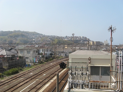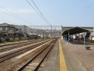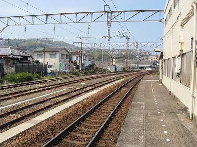 ホームより海側。小倉方。高台の住宅地に立っている赤白の電波塔はNHKのもの。
