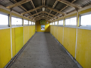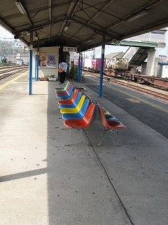 跨線橋にて。しかし椅子は青、赤、白で、跨線橋は黄色か。