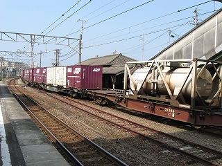 貨物列車が駅舎を隠している。