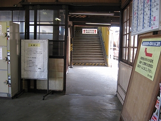 右手、ホームへの階段入口。窓はどれもサッシが入っていなかった。