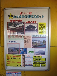 西大分駅からの観光案内。柞原(ゆすはら)八幡宮、うみたまご(水族館)、西大分地区ウォーターフロント、高崎山自然動物園(猿軍団がいる)が案内されていた。西大分地区ウォーターフロント以外はかなり遠い。