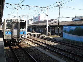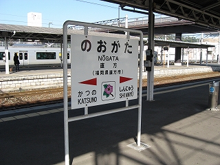 折尾から24分、終点の直方に到着。降りると爽やかな寒さ。車内は空気がこもっていたのだった。しかしこの直方駅の構内は、最近一から整備しなおしたらしく、何もかも新しい。そしてひと気が少なく、まるで都市郊外にできた新しい駅かのような雰囲気。設備も赤の自動販売機と待合所以外は特にない。車両の整備場を隣接しているが、これも春光に照り輝かされるものだった。筑豊炭田が隆盛だったころは、このあたりから網目のように鉄路があったが、今は平成筑豊鉄道がその一部を引き継いで運行しているばかり。それでこの駅はその平成筑豊鉄道の乗り換え駅にもなっていた。