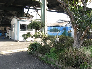 コンビニ生活列車のある駅舎軒下の風景。