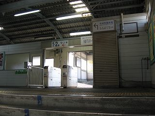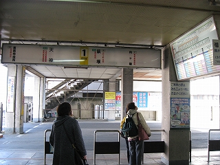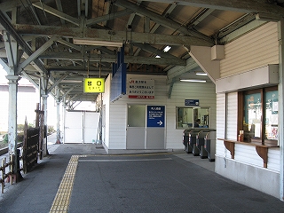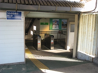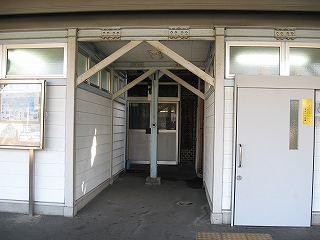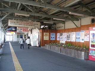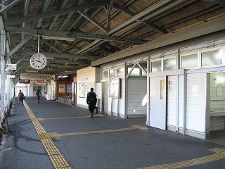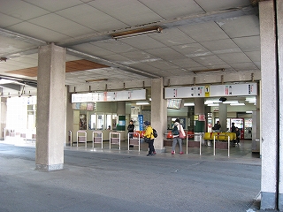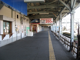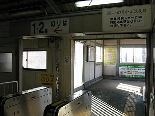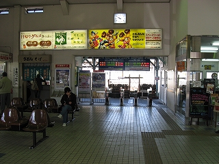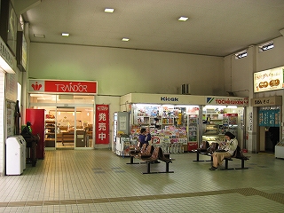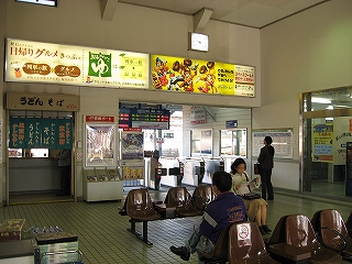 改札口前の風景。左手そばうどんの店の入口。
