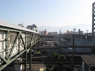 自由通路からは、留置線の多い構内の規模に比べて小さめな駅前が手に取るようだった。それより、遥か北方向にかすかに刃物のように山並みがかすんでいる。いっそうここが筑豊盆地になった。あれは福智山系というものだそうで、主峰が福智山(901m). 山頂付近は樹林がないそうだ。都市に近いのに登りがいがあり風景もいいらしく、よく登られる山なのだという。あの山塊を長く越すと、行橋などの豊前に出て、そして周防灘だ。