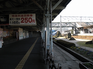 跨線橋に上がって驚かされる。裏口があり、自動改札があるのだが簡易自動改札で、駅員もいない。まるで自由出入口。筑豊本線、だいじょうぶか…。しかし、見ている人なんていらないほど信を置かれている利用者のいるところなのかな、とも考えた。跨線橋は仕切り壁で通路が二重になっていて、片方はくだんの平成筑豊鉄道のものになっている。そっちのほうはとても狭い。