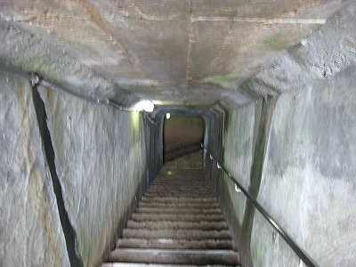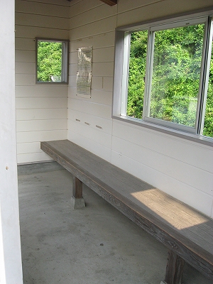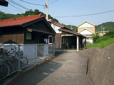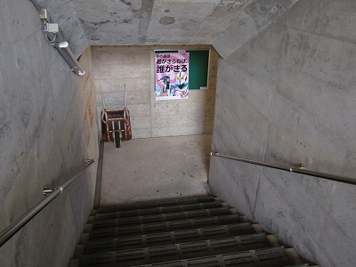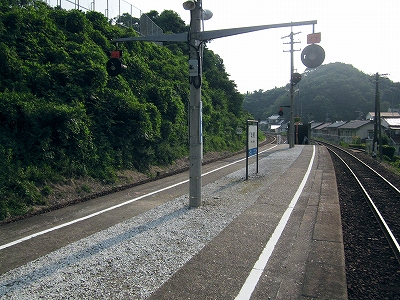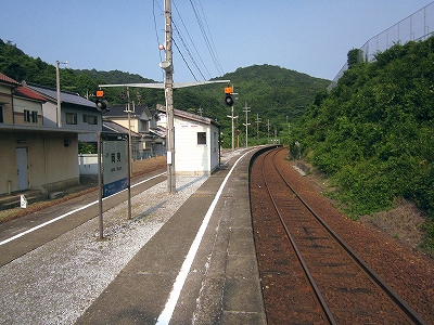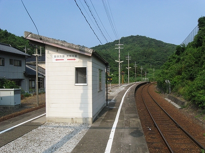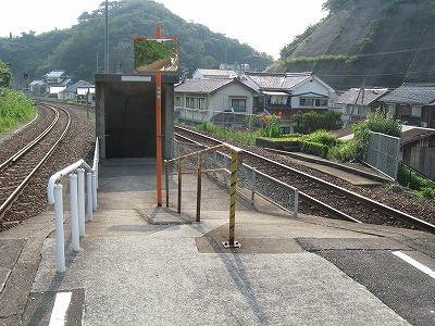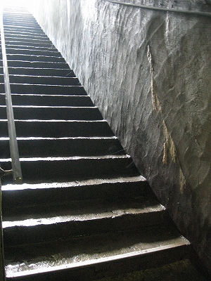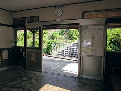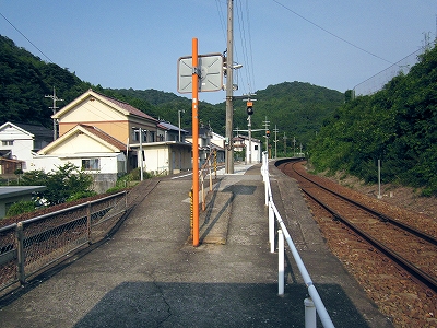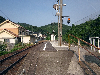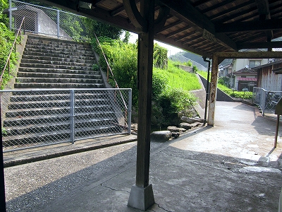 凸が去ると辺りは静かになった。ただ自分だけが涼しい駅舎の中に憩って、目つぶしの眩しさの構内の方を見つめている。築堤なので、かつての急登段が見えているが、そこはやはり階段をお上りくださいなんて案内があったろうか。