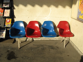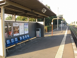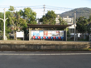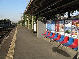 隣のホームの待合所。椅子が青赤青赤で九州だった。
