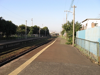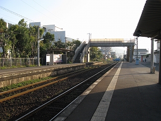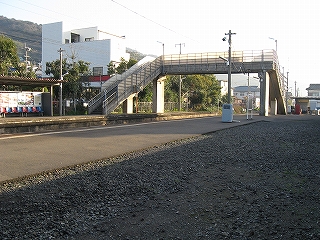 この駅は藤ノ木みたいな構内踏切ではなく、跨線橋だった。でも上ってみても、たいして風景は見えない。ついたてが高いし、なんとか覗いてもコンクリート塀や民家がちらっと見えるだけだ。でも階段を別のホームに下りる手前で国道沿いが見え、少し安心した。