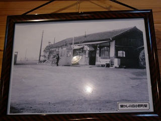 肌寒さから待合室に入り、戸を閉めた。落ち着く待合室だ。椅子に座って、西這田近くの店で買った飲み物とパンを旅の最後に、と取り出す。椅子にはさっそく彫ものの落書きがあり、新しくしてももうこれだから…。その待合室の中には旧駅舎の写真が飾ってあった。駅前がまだ未舗装のころのものだ。