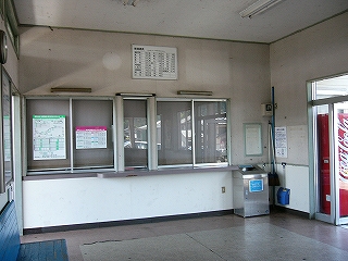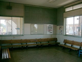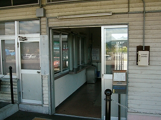 窓口2つは幕で閉じられたままだ。右のは手前に板が少し出ているから、荷物取り扱い用だったかのようだったが、板の位置と窓口がずれているので、窓口の体裁はあとから変えたものなのかもしれなかった。もうほかに何もないのだが、この駅、外へのドアだけは頑丈だ。丈夫な取っ手のついた、枠付きガラスの開き戸をつけていた。改札口の方にはサッシの引き戸がついていて、冬はその両方を締め切り、ここで列車を待つのだろう。