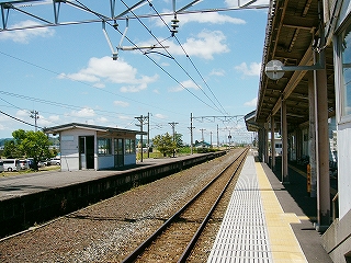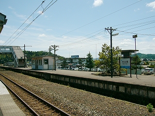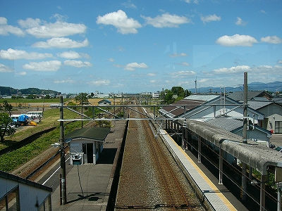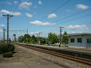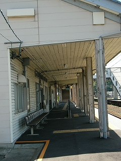 駅の建物は、屋根が大振りなのが特長だった。だって向こう側はその屋根の下にホームが入り、こっちには大きなポーチが入っているのだから。なんだか雪庇のようである。むろんここだってそれほど雪が多くないのだろうけど、駅前の右手から来る細い県道は、消雪パイプのあたりが赤茶けていたりして、白い板壁の駅舎は初夏の雪塊だった。