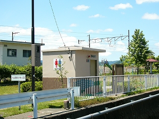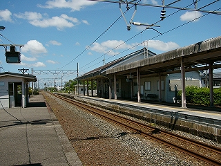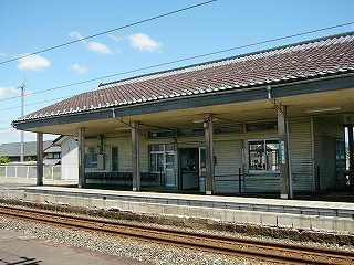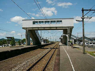 エアの音ともに折り戸が開くと、出ると意外にも涼やかな空気で、車内の匂いから開放された。北陸には珍しい、爽やかな時期だった。着いたのは駅舎のある1番線だったが、改札口の前あたりに、新しい段差とスロープ、そして柵がまとまっていて、降りてすぐ動線に戸惑った。つい最近かさ上げしたらしい。駅は、無人駅であった。