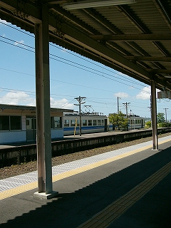 このホームを福井側に歩き、松のところまで来ると、低い山を続かせながらも緑や黄色の平地が広がっていた。雲もぽくぽく浮かんでいる。駅舎を見ると、軒下に白い柱が並んでいる。しかしかつては賑わっていたという感慨はなく、昔からこんな雰囲気だったようだった。