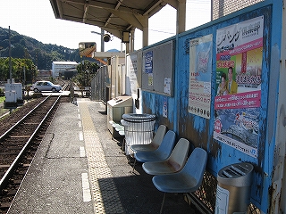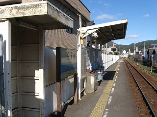 列車はいつしか、街中に入り込んでいた。停車すると明るく振り向いた運転士、列車を降りてみると、住宅に挟まれたホーム一つの駅で、せいいっぱい南中した太陽がまぶしくきらめいていた。ホームの一人掛けの椅子は茶色っぽくなり、その背後の、目隠しか風除けかの水色のベニヤ板はぼろぼろだった。駅名標も茶色くすんでいて、ぜんたいに傷んでいたが、この鉄の錆色は年月として、山を越えてきて海辺を走る力強さとして、頼れるもののような感じをこのホームだけの駅に与えていた。