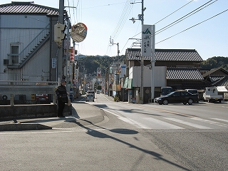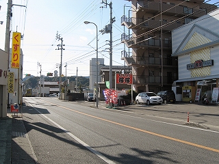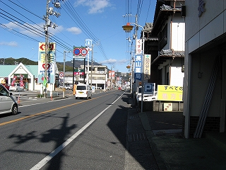 須崎方の風景。右手うどん屋。先のほうにさっきの交差点がある。